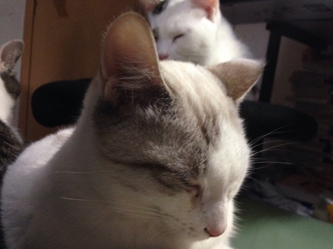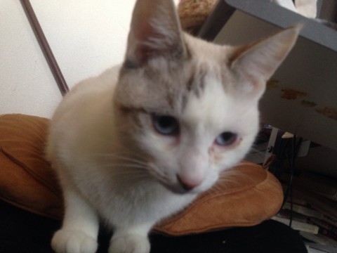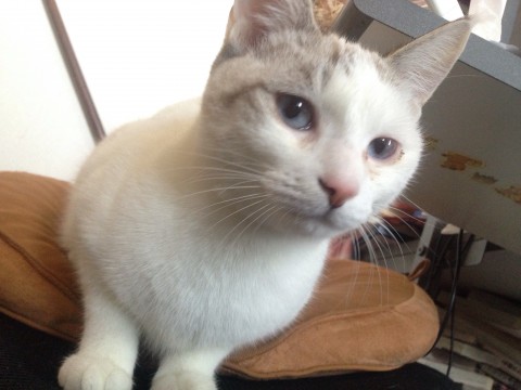 青目、白色に薄茶の斑点、尻尾は黒白のはっきりとしたシマシマ、薄くハチワレ、痩せ型、性格びびり
