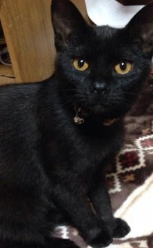 真っ黒の細身の尻尾が細長く、メス猫で首にはヒョウ柄で鈴付きの首輪を付けてます。首輪はひっかかると取れるやつなので、取れている可能性あり。