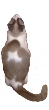 尻尾の先の方が少し折れた、ハチワレの猫です。