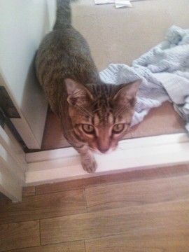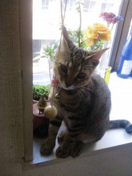 こげ茶と黒のキジトラです。シッポの先がステッキみたいに曲がった形をしてます。当時は赤い首輪をしてました。人懐っこい性格の子で、大きさは中猫で五キロ位です。泣き声は、ピャァ~と可愛らしいです。