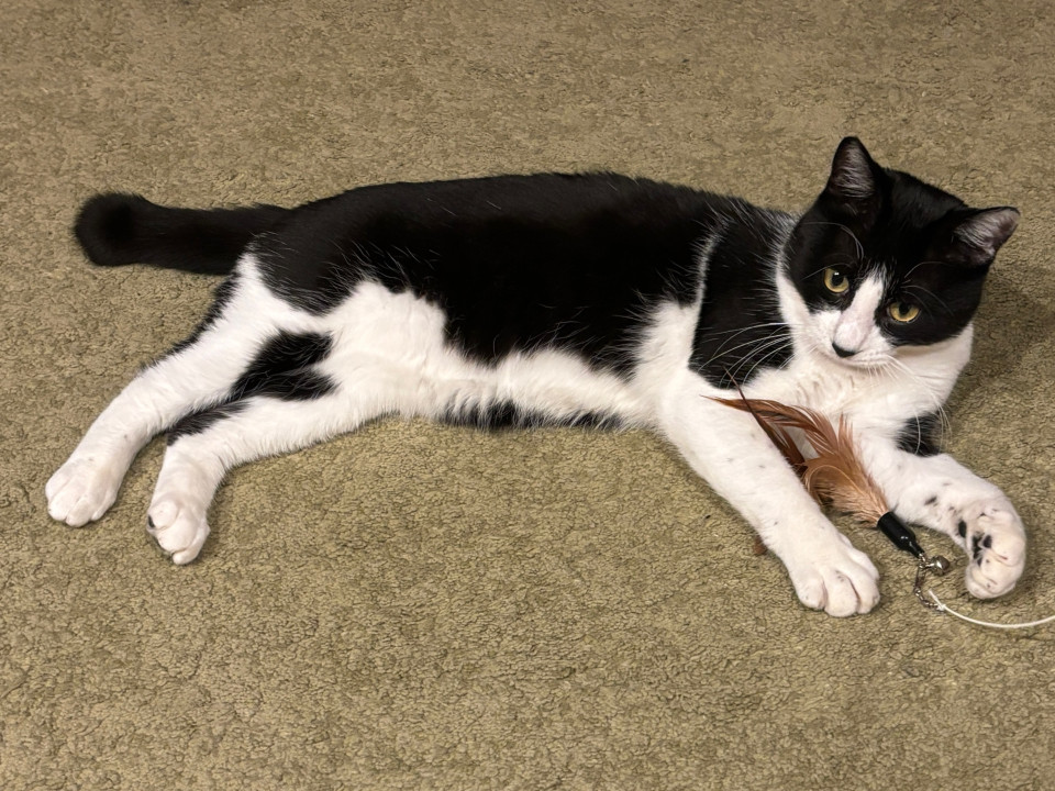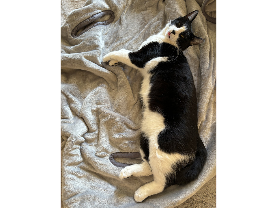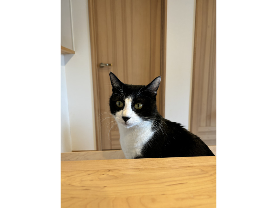 白黒のハチワレで鼻と口が黒、手足に黒い点々があります。