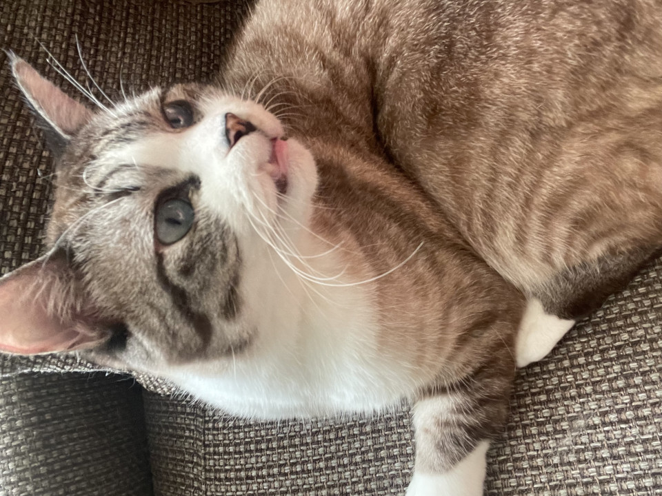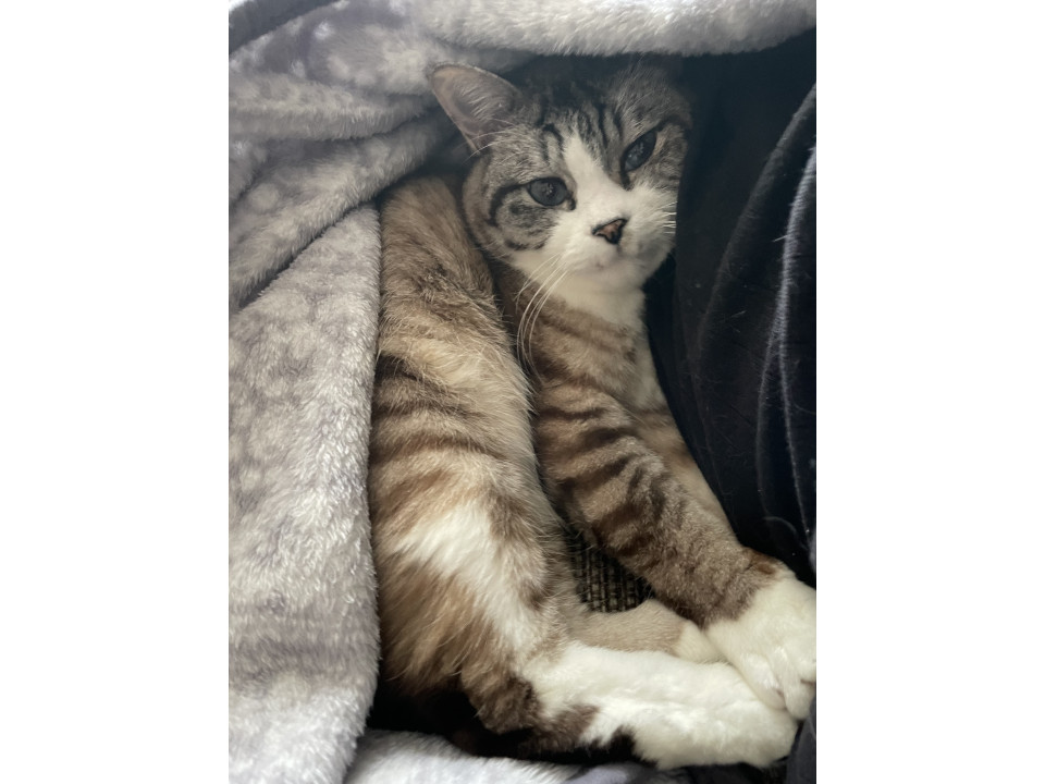 目が青で左耳外側に古傷(かけ)があります。口周り手足先、お腹の毛の色は白です。上の犬歯がありません。首輪をしていないので野良猫と間違われるかもわかりません。似ているなと思ったらまず連絡ほしいです。