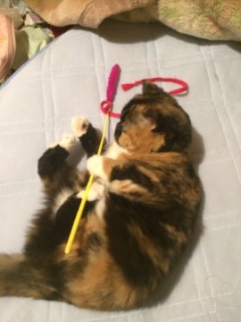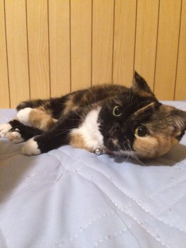 猫の特長は、三毛猫♀(毛色はあまり綺麗ではありません)大きさは小さいですが成猫。体重は2kgしっぽは曲がらず、タヌキの様なしっぽです。
