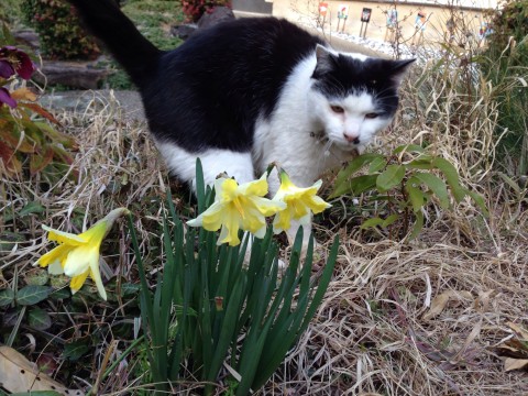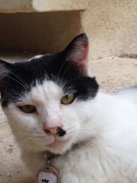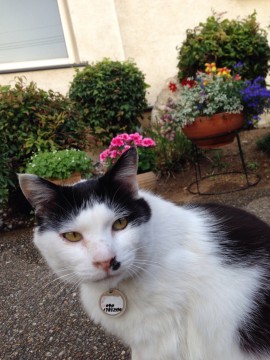 鼻の左下と頭と背中としっぽが黒。青い首輪してます。人懐こい猫です。