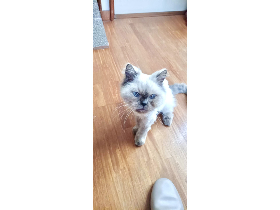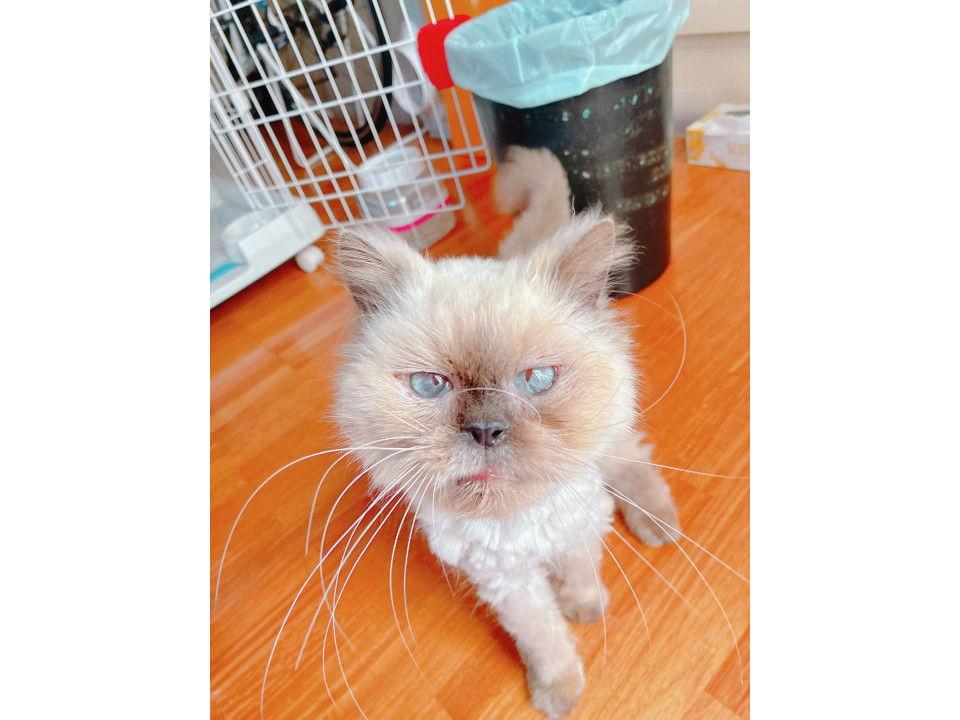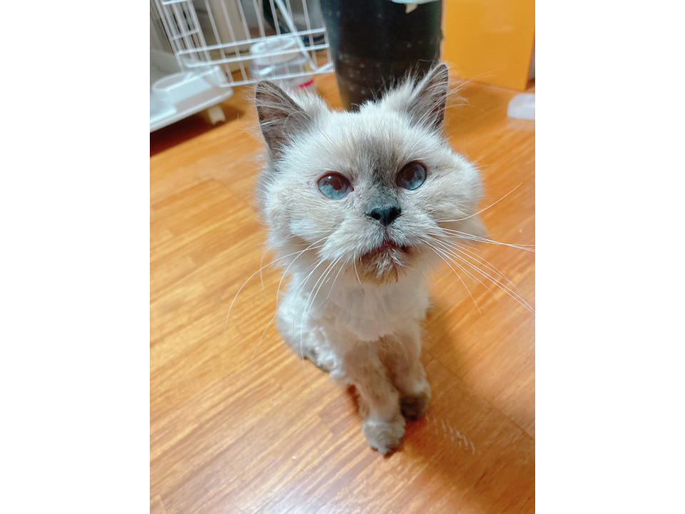 毛玉が酷かったのかハサミで切られたような跡があります。目は水色、右顔に傷あり、マイクロチップなし。人慣れしており、飼われていた形跡があります。