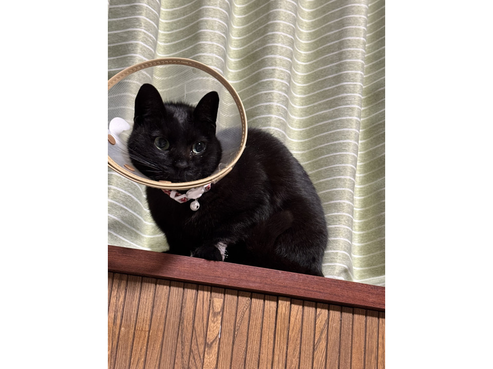 小柄、短髪、長尾、避妊済みで鈴付き赤色の首輪をしています。