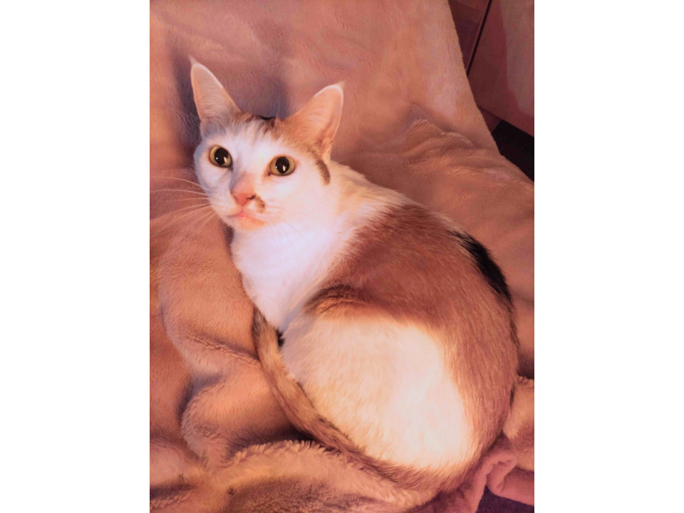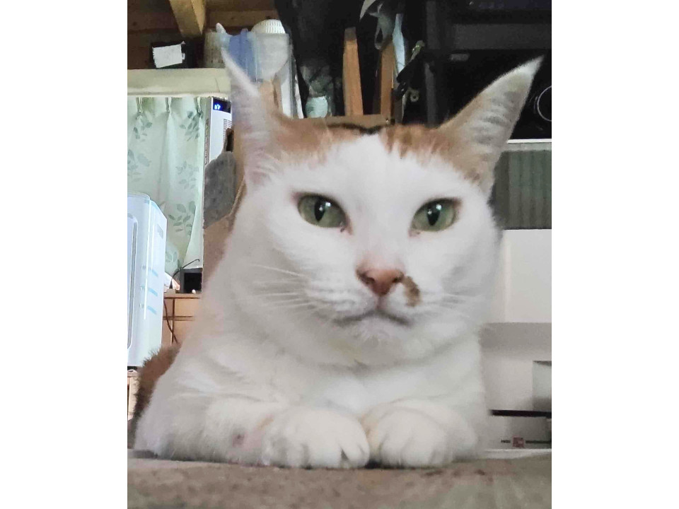白多めの三毛猫、体重5キロ、鼻の左側に茶色のぶちあり、両耳は茶色で後頭部は黒のぶち。