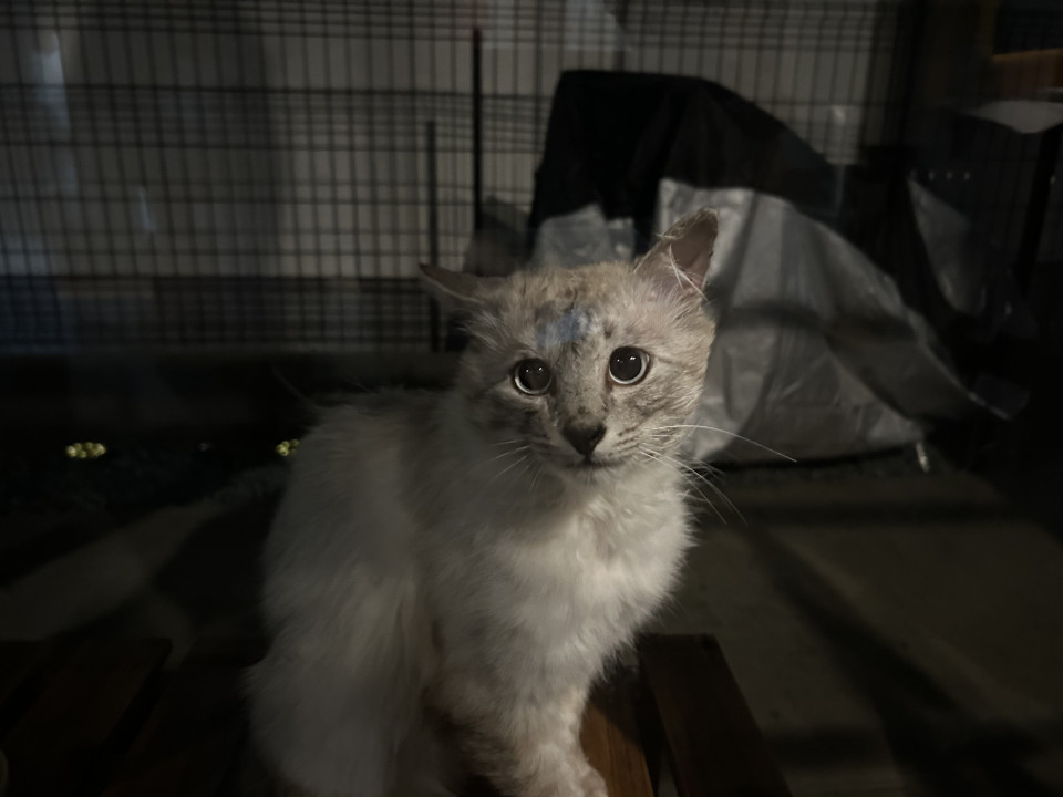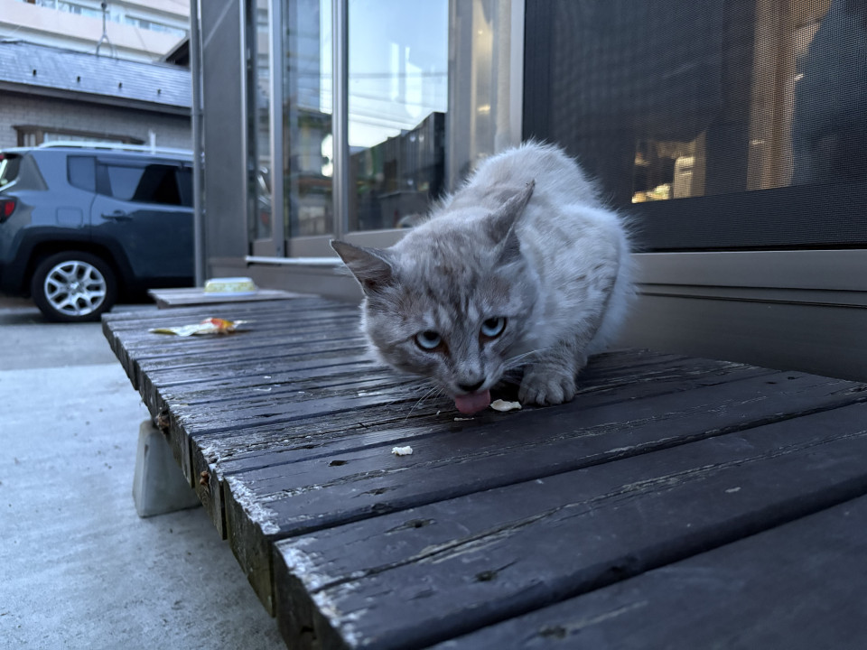 シルバー系でブルーアイの長毛のネコちゃんです。ほぼ毎日ご飯食べに現れます。少しは触らせてくれます。