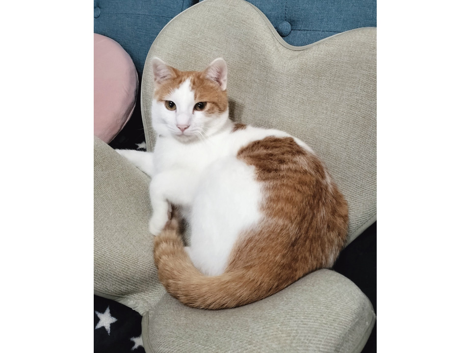 去勢済み、白が多めの茶色ハチワレ、手足が長め痩せ気味です