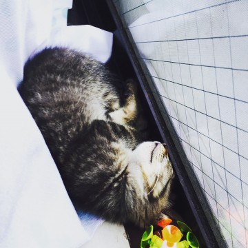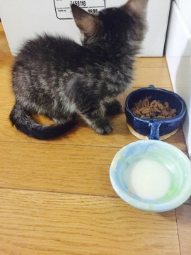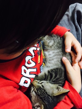 黒とグレーと茶色の混ざったキジトラ、おなか側は顎から後ろ足にかけて白っぽい中に茶色のトラ模様、尻尾は長く真っ直ぐで黒いがうちがわが白っぽい、ヒゲは白と黒のmixで白多め、人懐っこくめちゃくちゃ甘えん坊、おなかが空くととにかくミャーミャー鳴きます。甘え上手なので抱っこされても逃げることもなく抱かれ、すぐ寝ます。手足がかなり長めです。