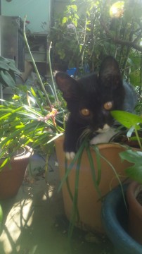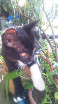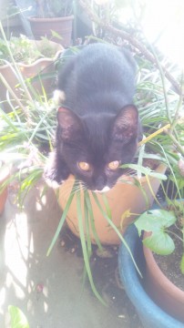 黒猫です。左前足がソックス位の白色で、他の足にも少しですが白色模様です。