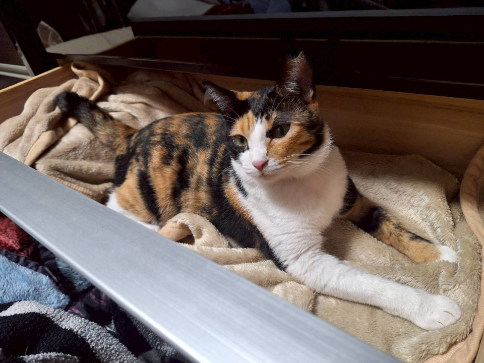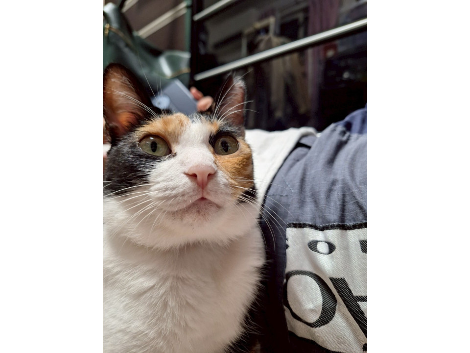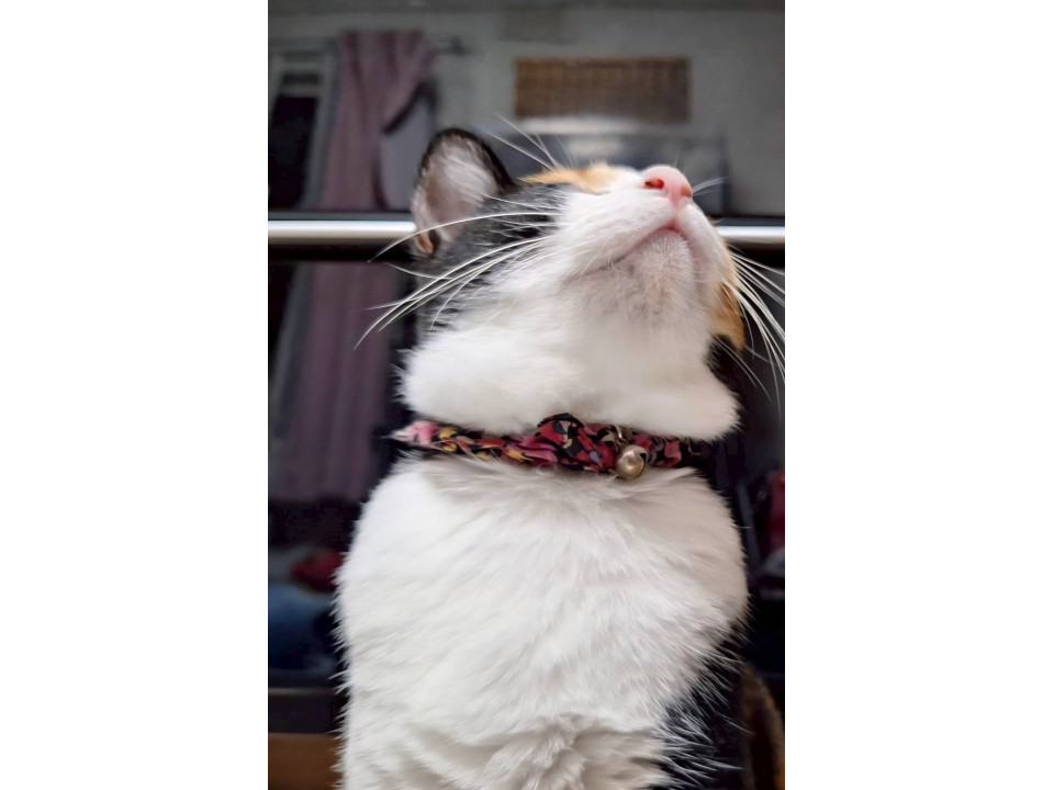 左耳桜カットの女の子の三毛猫です。シュシュタイプの首輪をつけています。黒地に赤やピンクの花柄の首輪です。比較的、人にはなれています。猫用のカニカマが好きです。