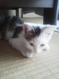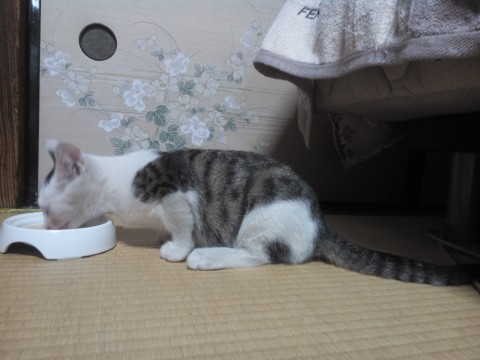 ・サバ白の日本猫:頭,背中,脚の一部,尻尾がサバ、他は白。