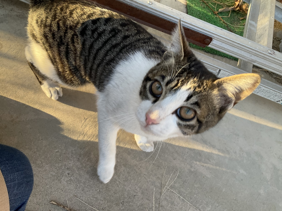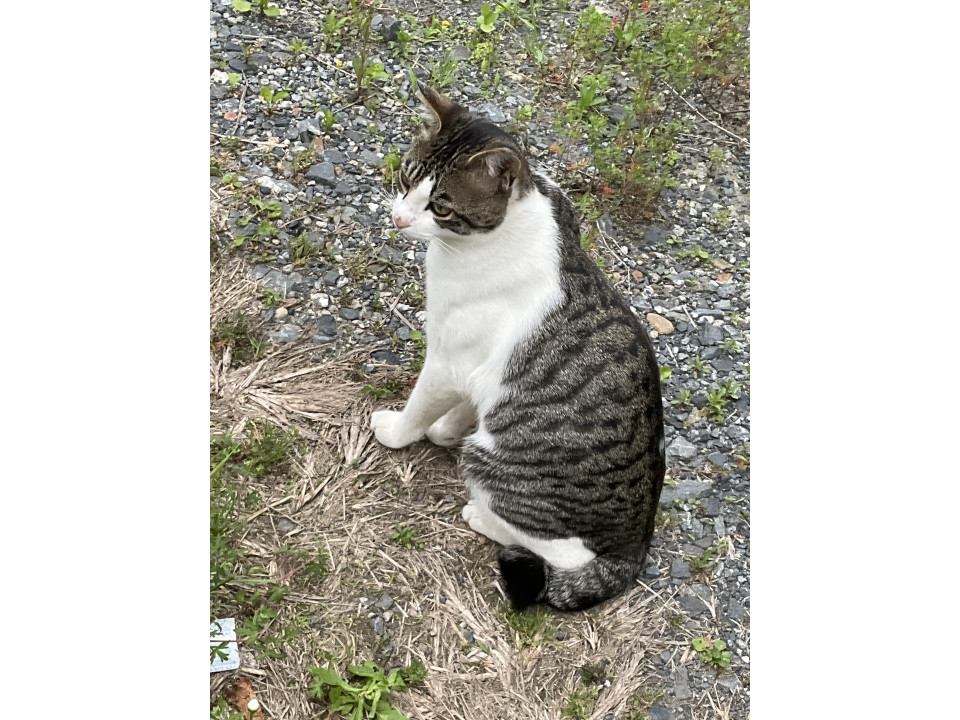 キジ白、カギしっぽが特徴。細身。体重約5キロ。オス(去勢済み)。人懐っこい甘えん坊で人見知りはしません。撫でられるのが大好きです。活発で好奇心旺盛です。よく鳴きます。名前を呼ぶと返事をします。食いしん坊で煮干しが大好物。首輪はしていません。背中は茶色いトラ柄ですが、右腰ちょっと上の辺りに直径2センチほどの白毛の部分があります。