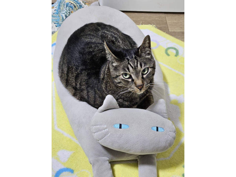 かなり黒っぽいカラーのキジトラですかなりのビビりでスリムです。歯周病の治療で歯が一本もありません。去勢手術はしてますが耳カットはないです。