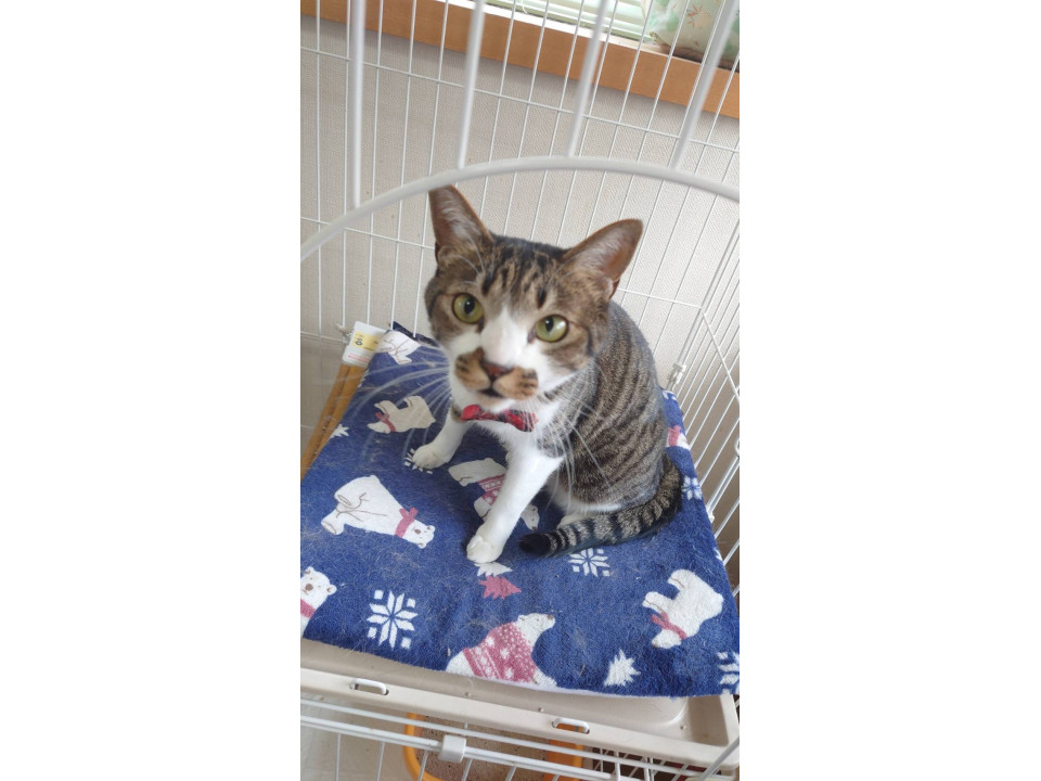 赤いタータンチェックのリボン付き首輪をしています。口の周りが薄いおうど色をしている。