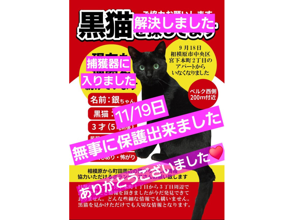 2か月間心配してくださった皆様、情報を拡散してくださった皆様、本当にありがとうございました。SNSでの発信と地道なチラシ配りでの情報収集、トレイルカメラによる見張りが功を奏しました。情報をくれたお宅のお庭に捕獲器を置かせてもらったら、それに入りました。これからも、まず脱走させないこと、そしてGPS付きの首輪をつけてもらうこと、マイクロチップ装着など、いろいろな事を徹底していきたいと思います。