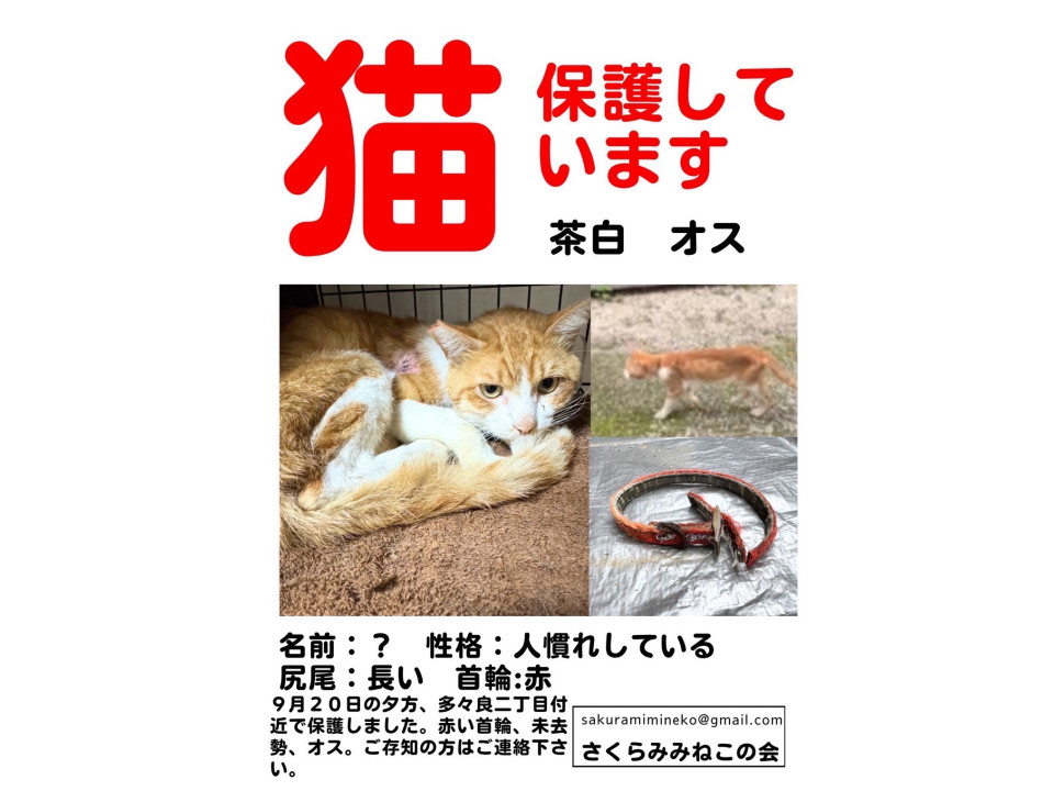赤いカープのロゴの入った首輪をしていましたが、しばらく放浪していたと思われ、首輪が襷掛けになり、脇に大きな傷が出来て化膿していました。未去勢でしたが、保護してくださった方が縫合と一緒に去勢耳カットをしてくださっています。傷の抜糸までの期間があるので、飼い主さんの情報を求めています。