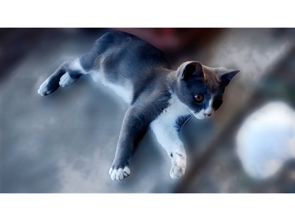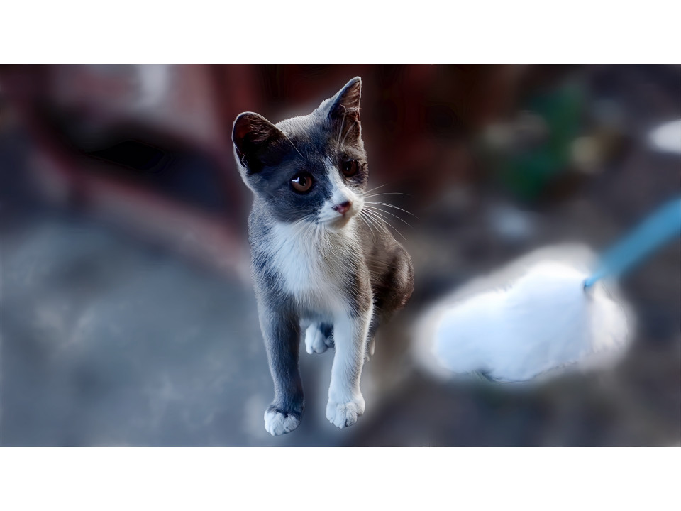 右手が灰色、左手は白色。灰色のハチワレ子猫です。