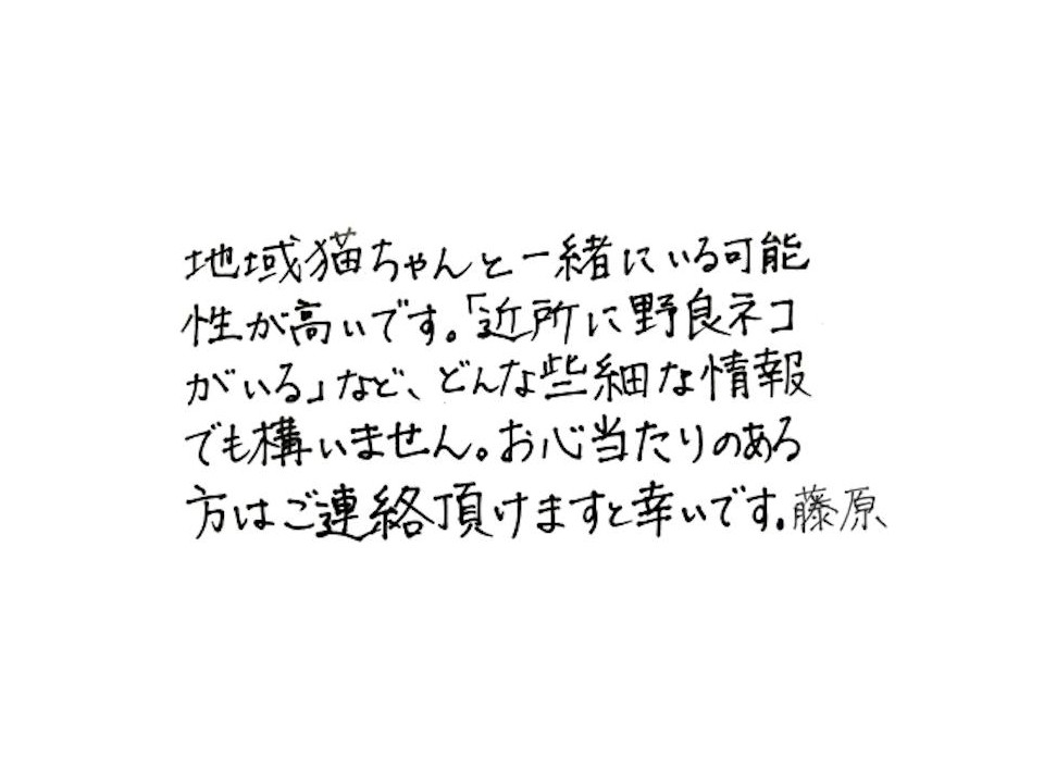 地域猫ちゃんと一緒にいる可能性が高いです。近隣で餌を与えてくださっている方がいらっしゃるかもしれません。「近所に地域猫がいる」など、どんな些細な情報でもかまいません。情報をお寄せいただけると幸いです。