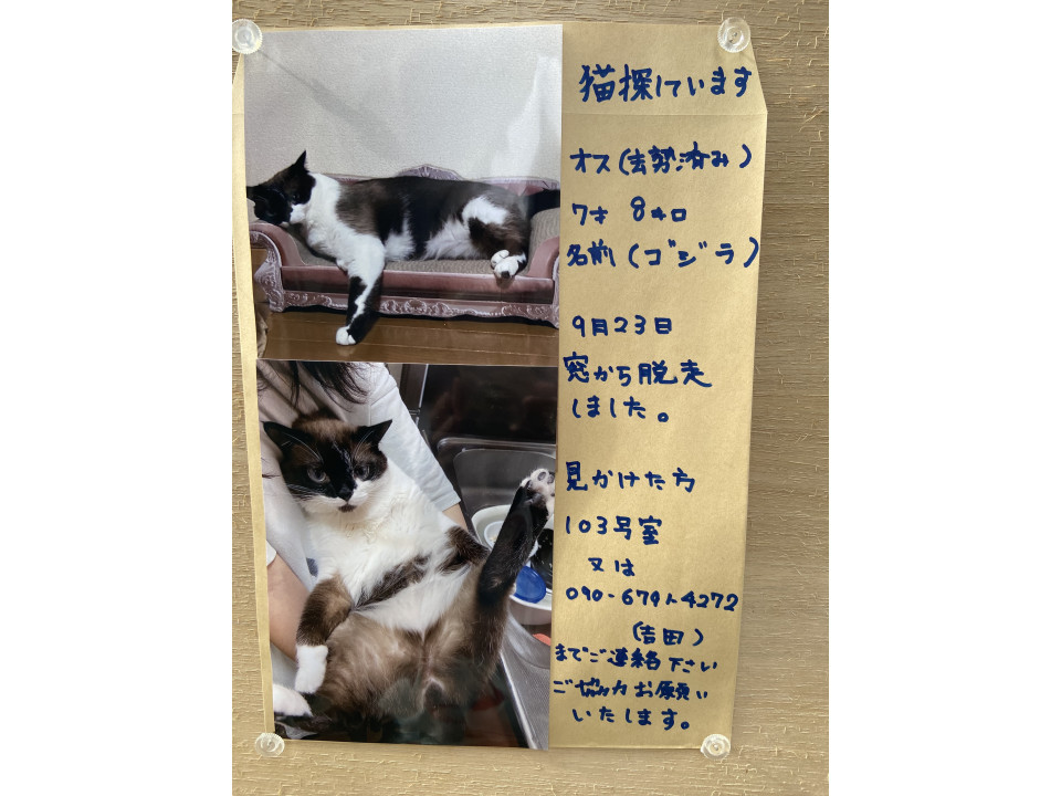 23日に窓が開いている事に気づかず出で行ってしまいました。最後に見たのが23時頃で気がついたのは朝の9時でいつ出で行ったのかわかりません。家から半径500メートルを毎日何時間も探していますが姿を見る事もできません。去勢済みなのでとも思いましたが、もしかしたら思っているより遠くに居るかもと投稿しました。情報お持ちの方ご協力どうかお願いいたします。