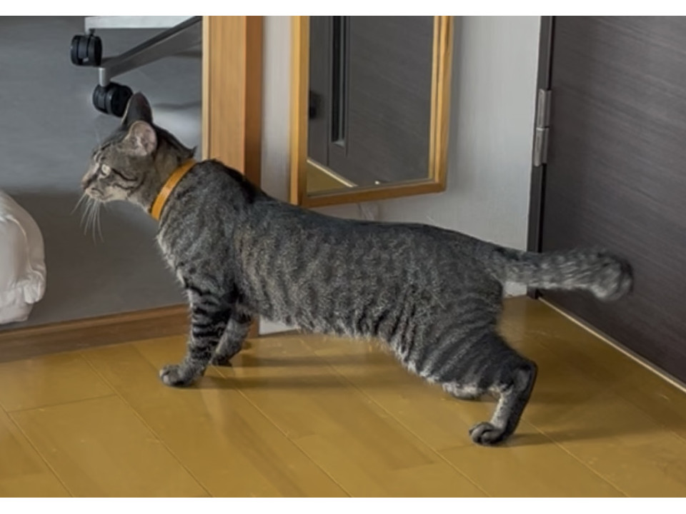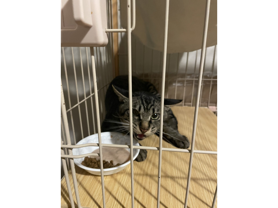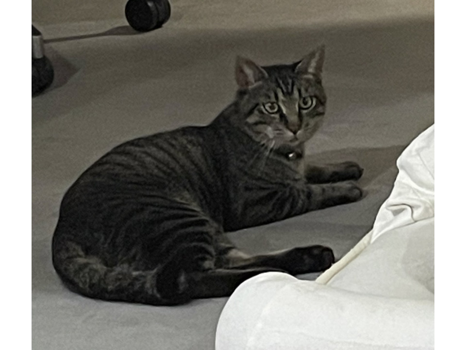 目が鋭く黒部分が多めのキジトラです。とてもビビりなので暗くて狭いところに入ろうとします。しっぽは鍵しっぽですが、先端だかなので一見長尾に見えるかもしれません。失踪時は黄色の革製の首輪をつけておりました(鈴付、猫の名前と電話番号が記載)