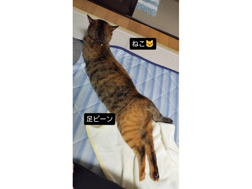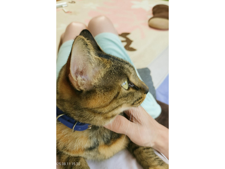 特徴:キジトラ(茶×黒の縞模様)、青い首輪を着用(鈴付き)