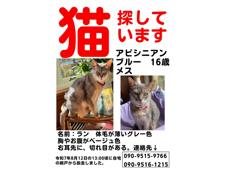 2025年8月12日に自宅の網戸から脱走してしまいました。