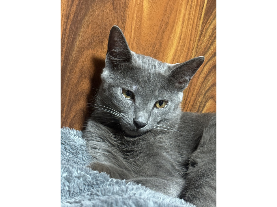 黄色い目で、毛の色はグレーです。右目はよく涙が出ます。