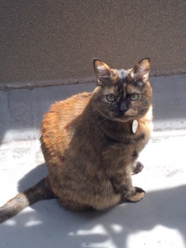 ガラのある茶色(サビ猫)。太り気味でお腹が下がっています。オレンジ&黄色の首輪に銀の名札をつけています(外れている可能性もあり)。