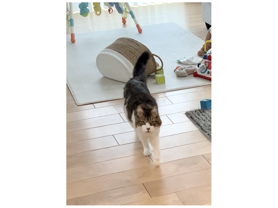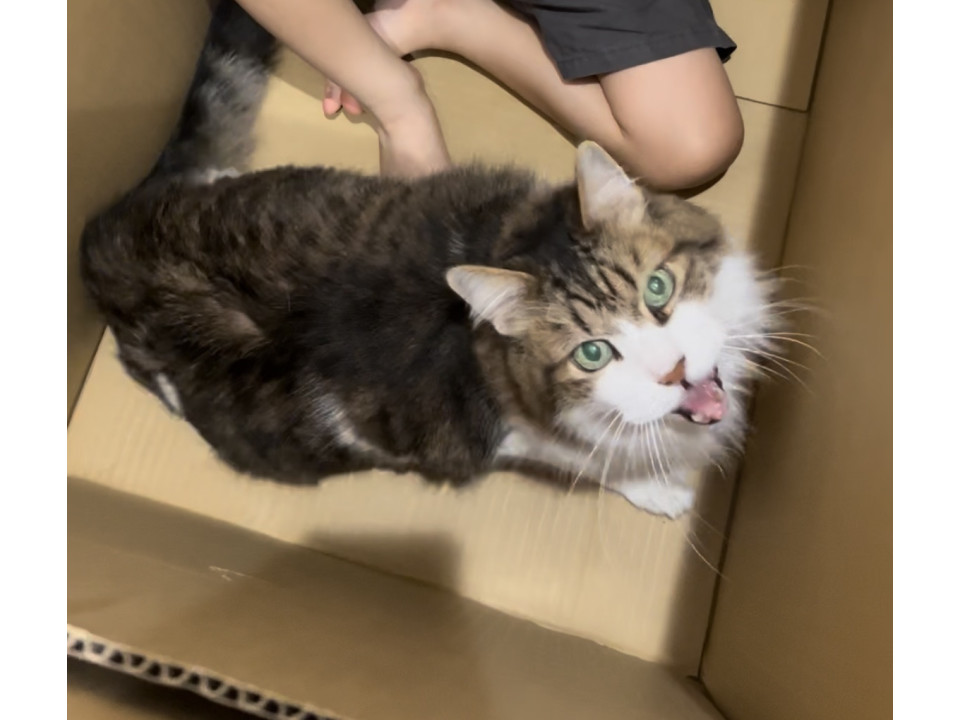 頭と背中が黒茶で、お腹と手は白のキジトラです