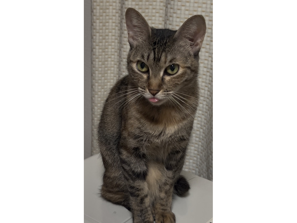 普通の猫より少し小柄で、食べ物には目がないです。怖がると落ち着くまで出てきません。首元にマイクロチップが入ってます。黒と茶色の雑種です。好奇心旺盛ですが怖がると警戒心が強くなって逃げてしまいます。