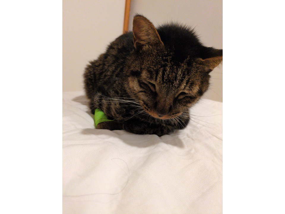 宇佐市の長洲漁港くであまり動けない状態だったところを保護しました。獣医さんによると1歳は超えているとの事ですが、痩せていて2.8キロしかありません。腎臓の働きが悪く貧血気味で週一回程度で病院に行っています。