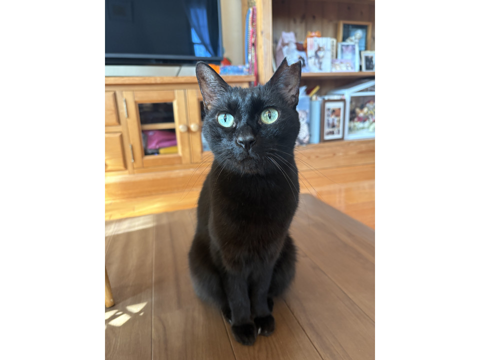 黒猫、がっしり体型、左耳カットあり、左手の人差し指に白い毛が少しだけ生えています。