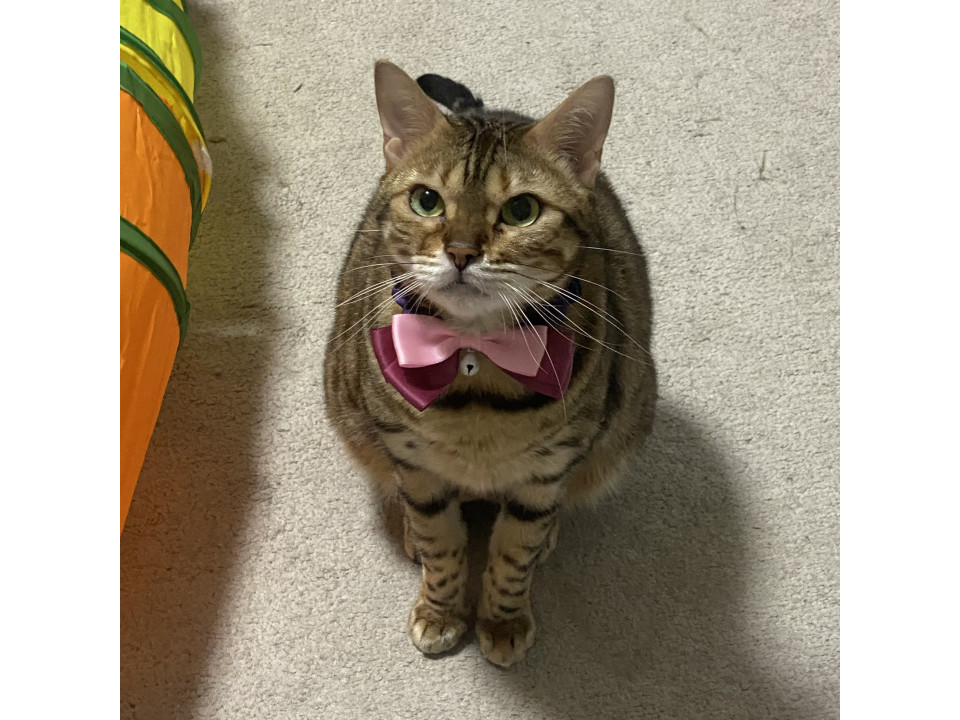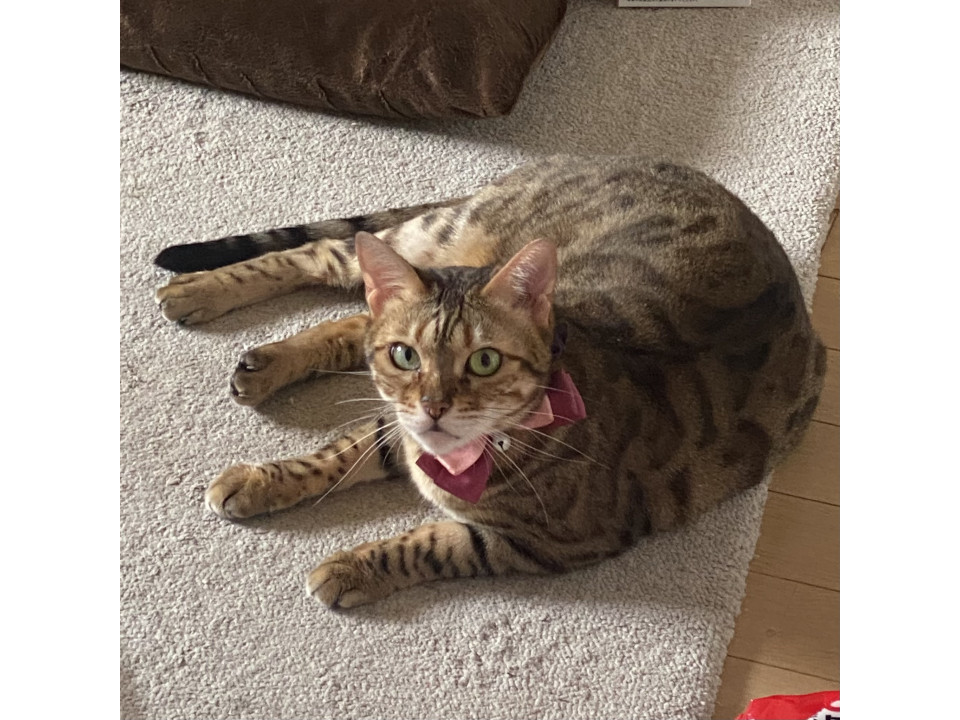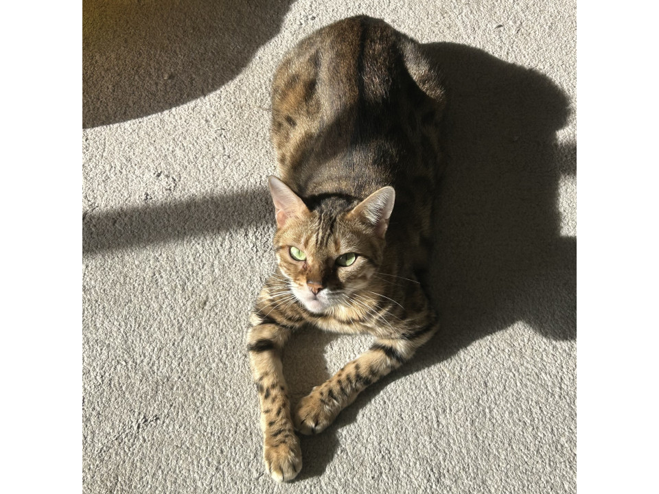 ヒョウ柄模様、茶色、薄緑の目をしていて、人には慣れてるが、すこし警戒心あり