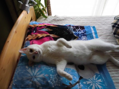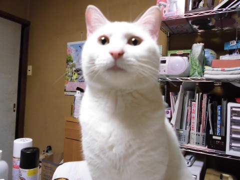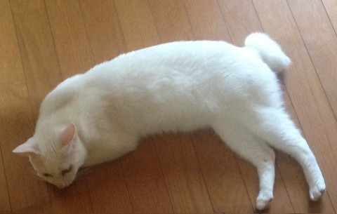 真っ白の猫で、尻尾が、くるりと一巻きしている「巻きしっぽ」になっていて短いです。