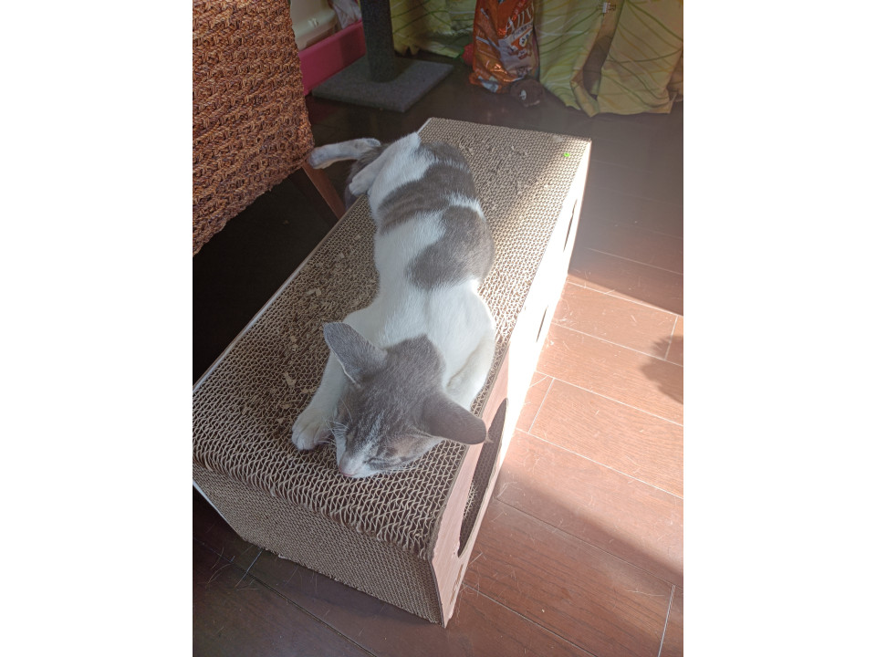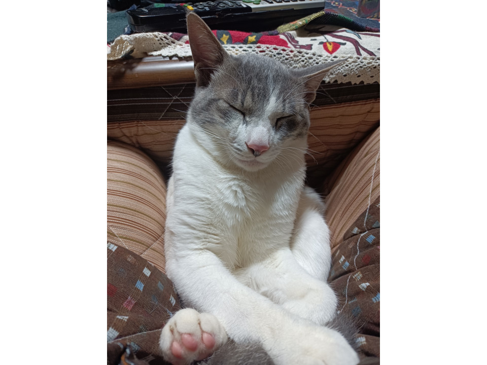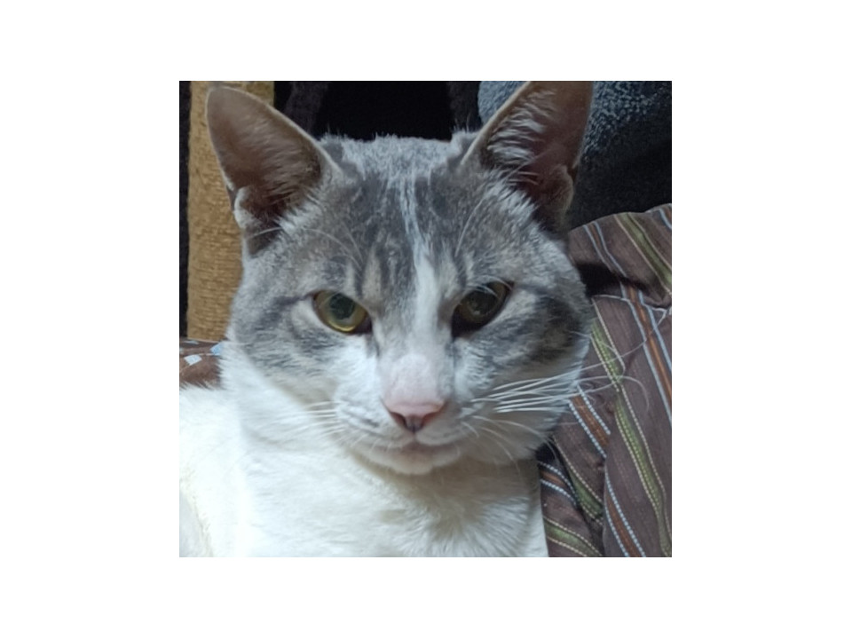 グレーのハチワレで、お腹は白です。