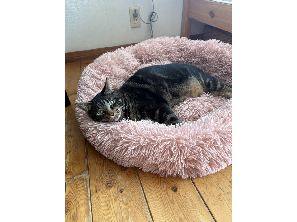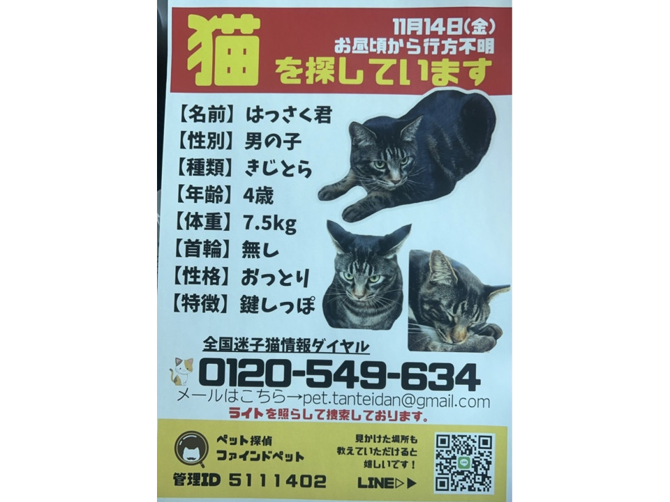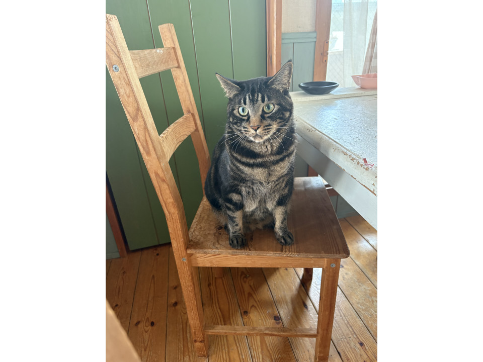 とっても大きな(8キロ)の毛並みが艶々なほとんど黒のキジトラです。尻尾がカギ尻尾で小さくて丸いです。穏やかでビビりな生活なので、何処かでじっと隠れてるのかなと思います。
