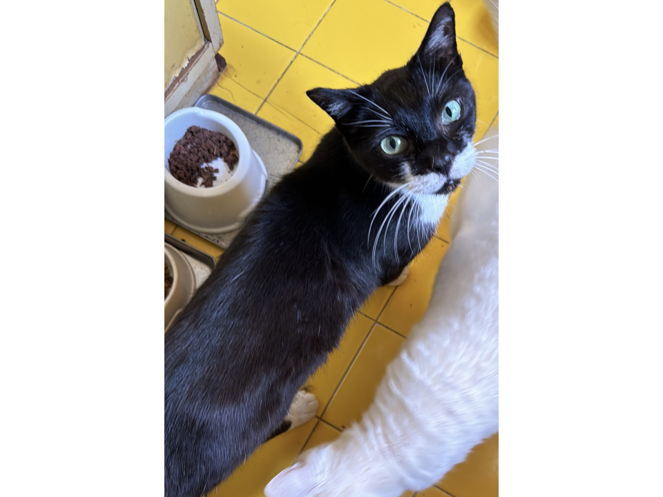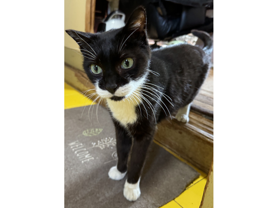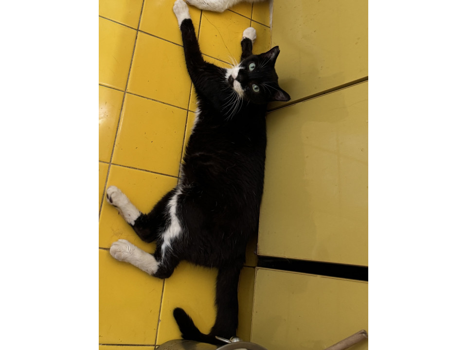 慣れた人にはフレンドリーですが、基本怖がりな男の子です。黒色ですが、胸元、鼻の下、前足と後ろ足が白いです。