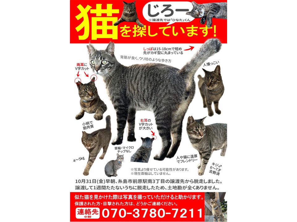 糸島市志摩船越の港から前原駅南三丁目に保護されましたが、先住猫と一緒に脱走、じろーだけがかえってきていません。保護されたばかりで土地勘がありません。見かけた方は写真を撮っていただき、連絡ください。船越の港には仲良しの猫ちゃんがたくさんいましたので、志摩方面に向かってる可能性もあります。かなりの遠距離ですが、よろしくお願いいたしますm(_ _)m