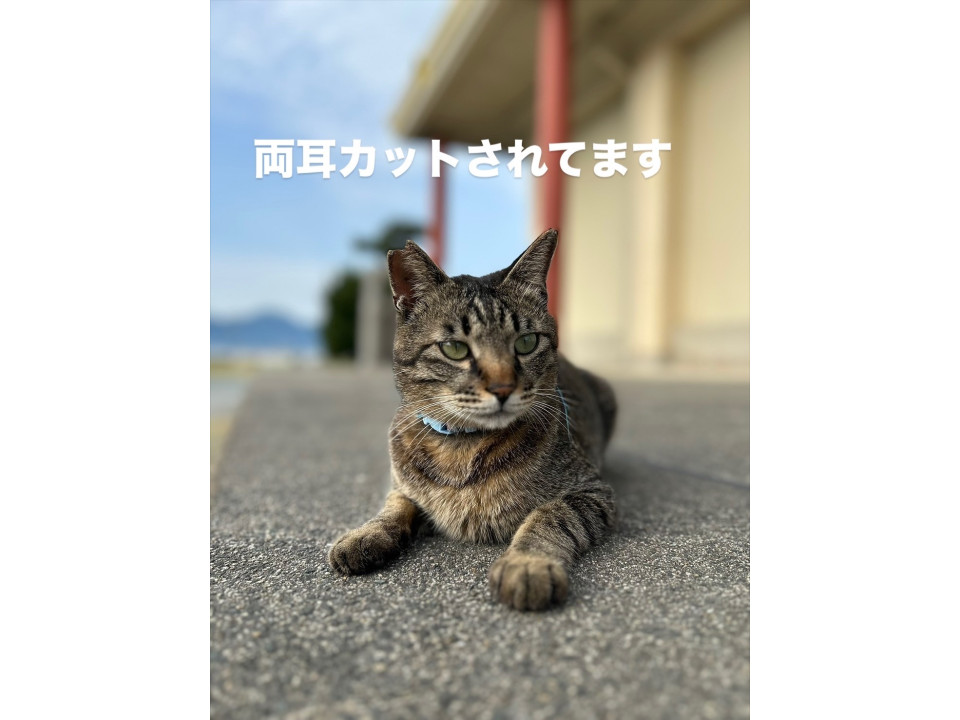小柄で筋肉質のキジ猫、ウリ坊の様なトコトコ歩き、両耳がV字カットになっています。(オスなので向かって左はV字がハッキリしてます)