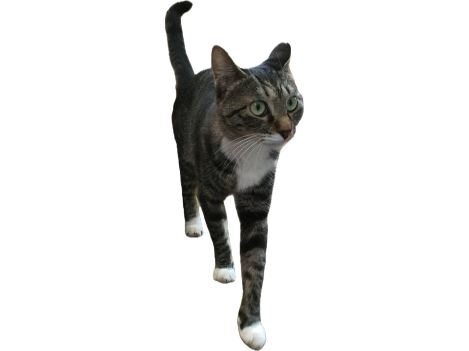 左耳カット、避妊済み、口から胸にかけて白毛、両手が白手袋・左後ろ足が白のハイソックス、長尾カギしっぽ、目は黄緑、細身で3kg位、性格は臆病で人見知りです。