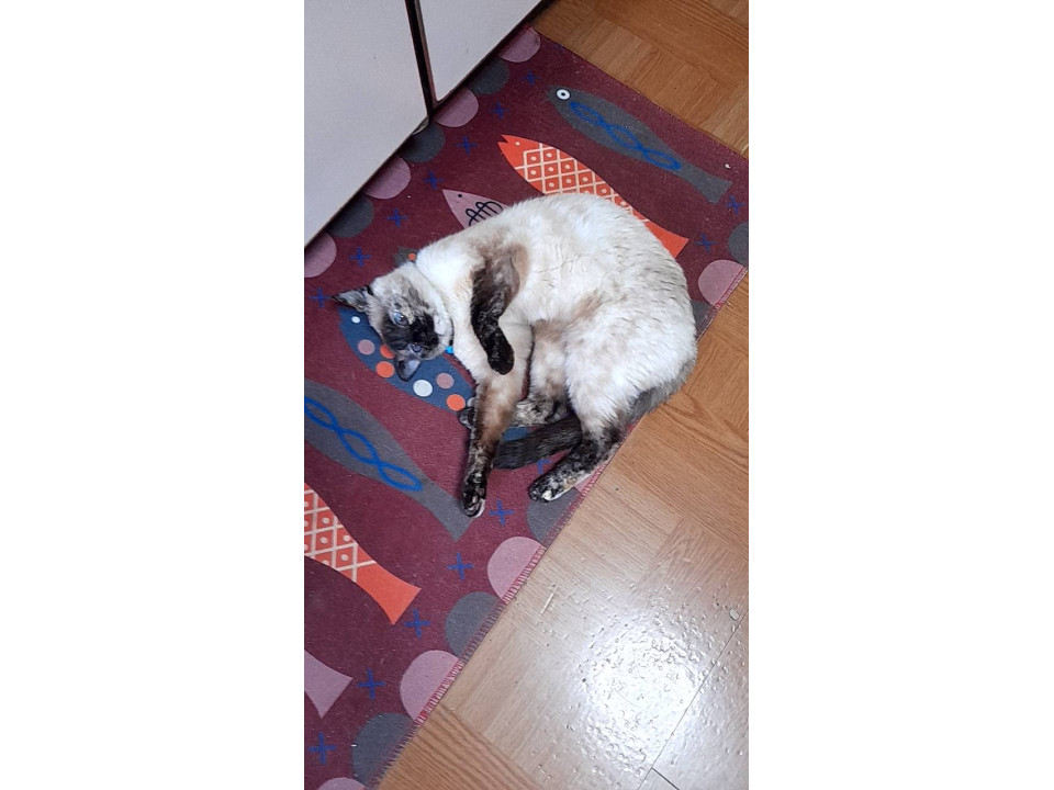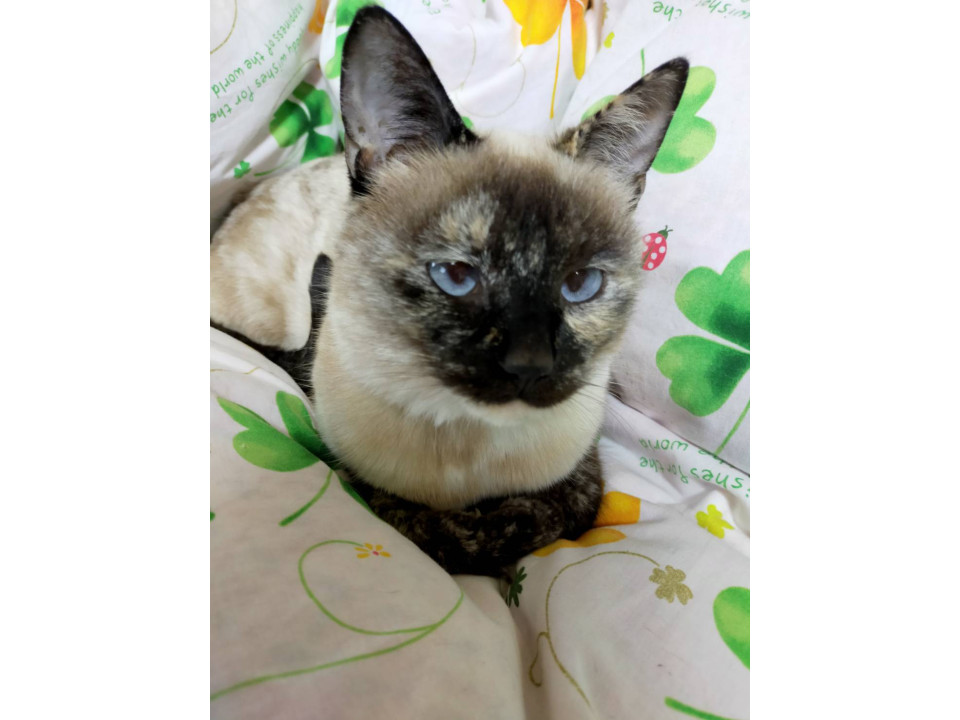 雑種シャムです。綺麗な澄んだ青い目しています。アザラシみたいな顔です。左耳が薄茶色がかかて右足先に白い所もあります。海苔が大好きです。
