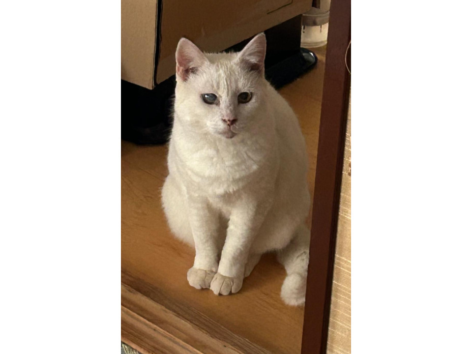 片方の目が白く濁っています。耳のカットなし、小さめの身体にまっすぐ長いしっぽです。
