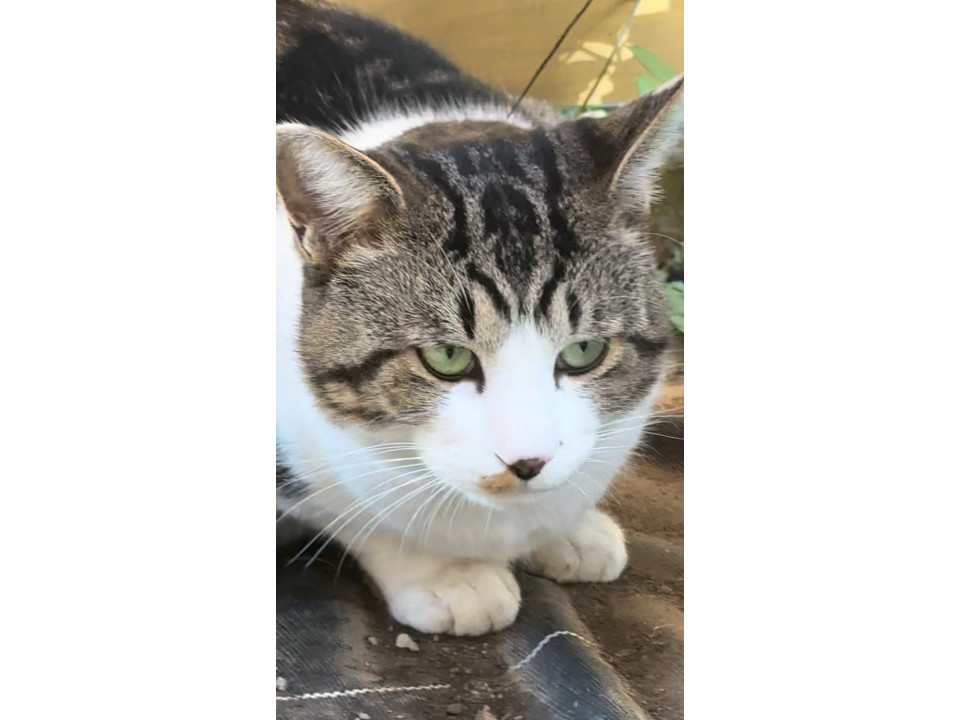 がっしり体型、耳の先が白い、人懐こい、未去勢、首輪なし