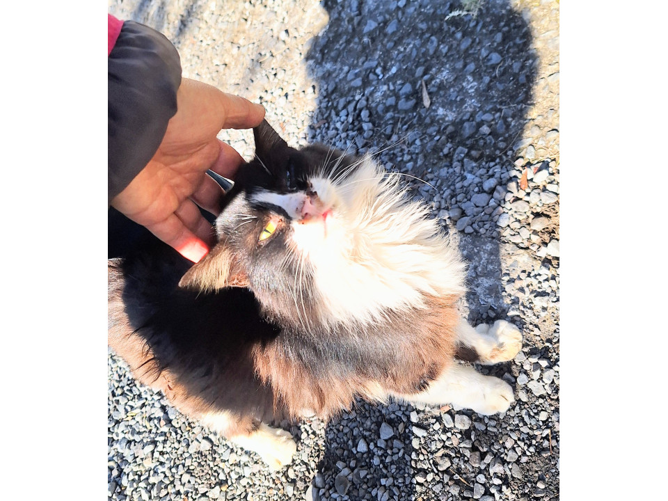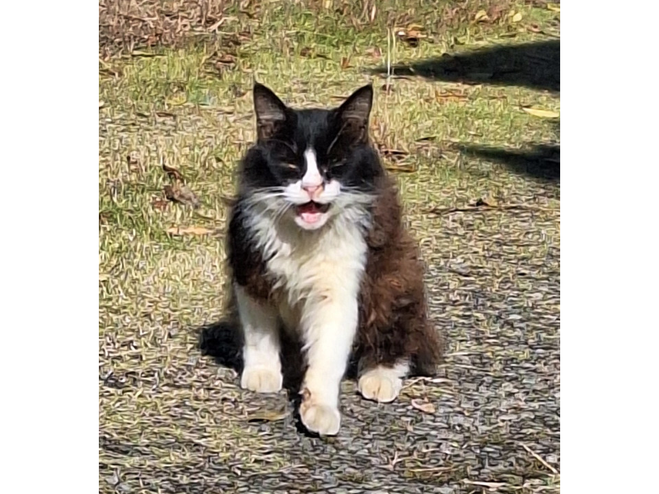 白黒ハチワレ長毛。短いかぎしっぽ。まだ子どもなのか、小柄。去勢はしていない。とても人懐こく、鳴きながら甘えてきます。