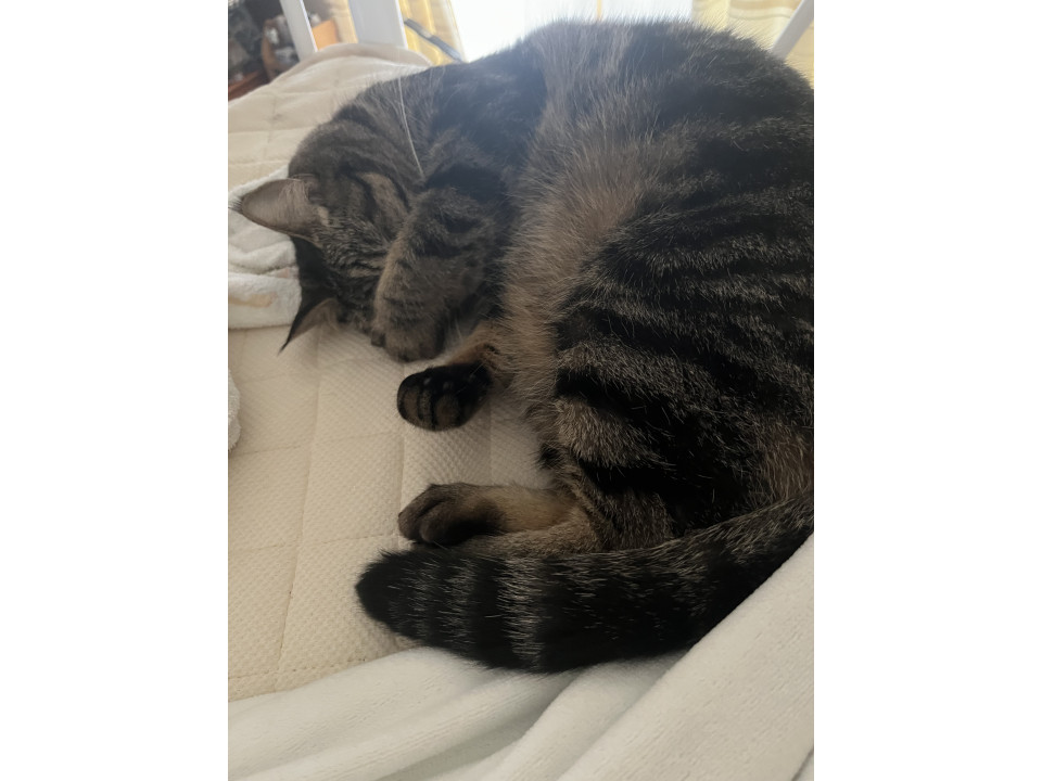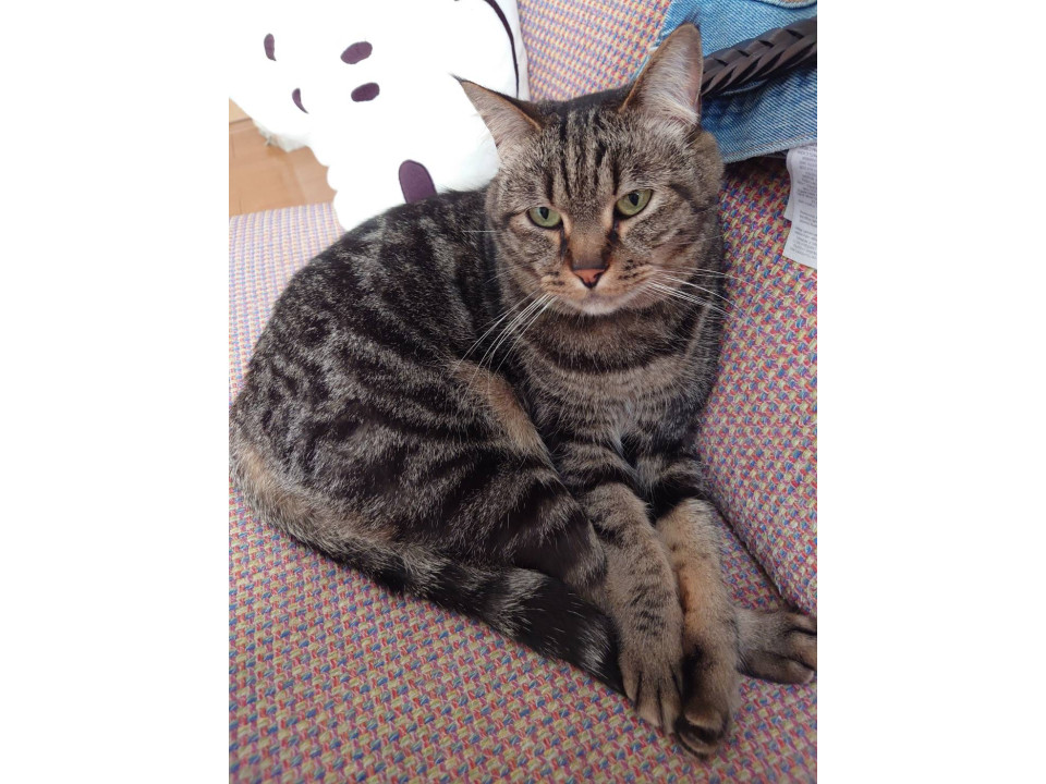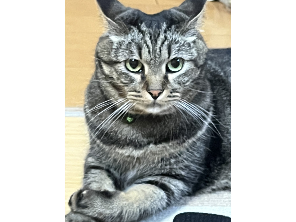 緑の鈴を着けています。キジトラ柄で、顎の下のみ白いです。ヒマラヤンと日本猫のミックスで、毛質は少し柔らかめです。