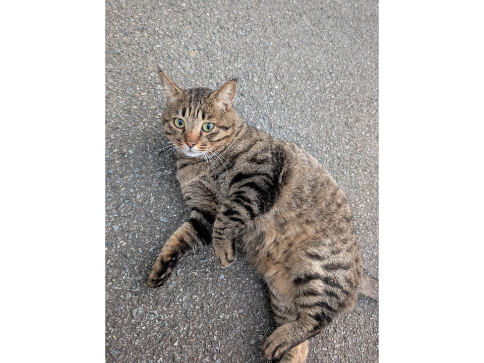 少し茶色味がかったキジトラです。目がまん丸でするどい目つきではありません。