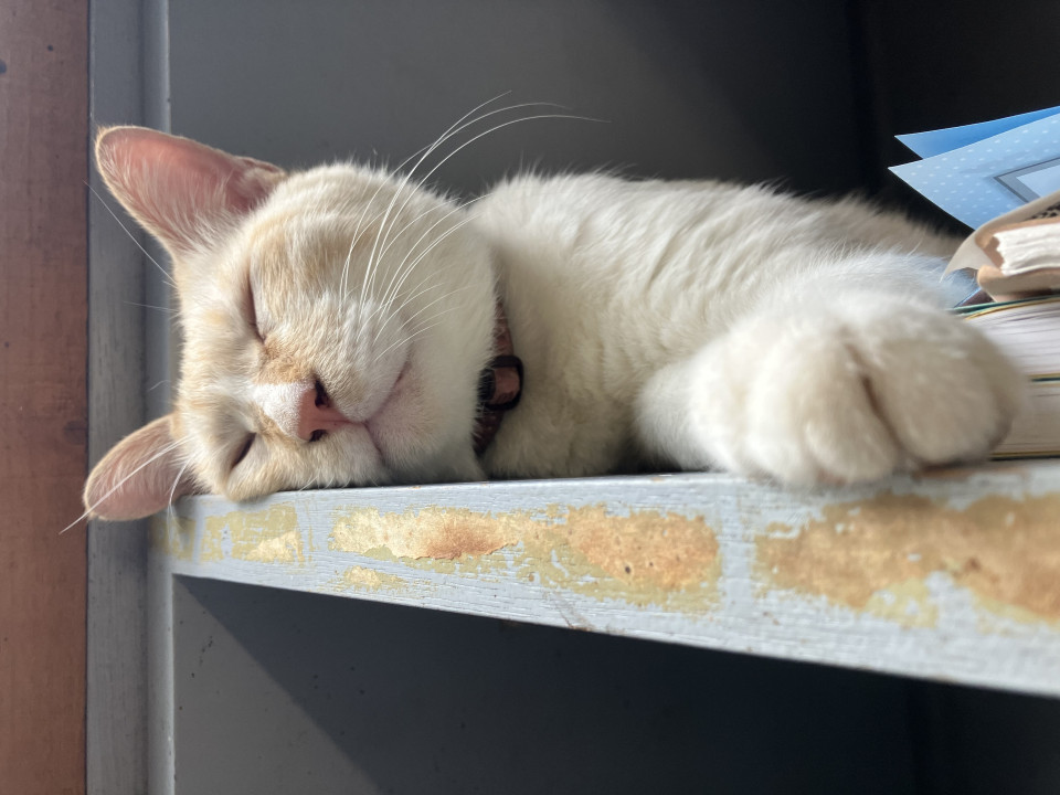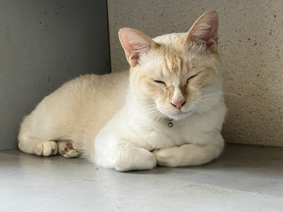 目が薄い青で、しっぽが短く先端が折れ曲がってます。とても人懐っこいので呼んだらすぐに来ます。