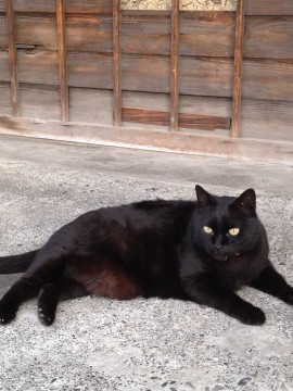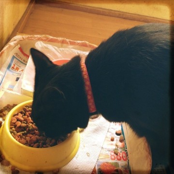 黒猫ですが、腹部はこげ茶色。赤い首輪に赤い鈴つき。体型はポッチャリとしており、小顔です。